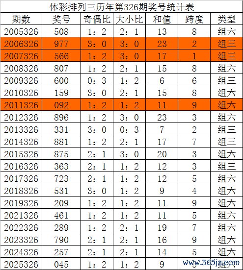 陈设三第2025326期奖号为045,奇偶比为1:2,大小比为1:2,和值为9,跨度为5。
